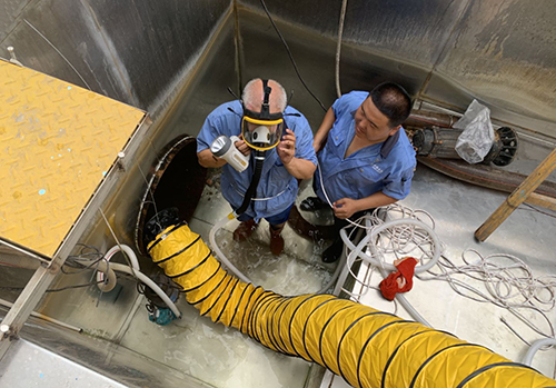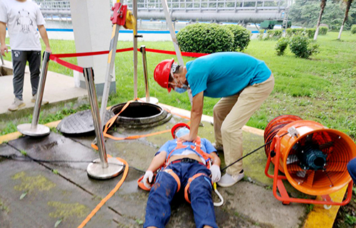 ↑ 金達環境旗下的天津重科水處理有限公司開展作業演練、應急處置和有限空間搶險維修等。